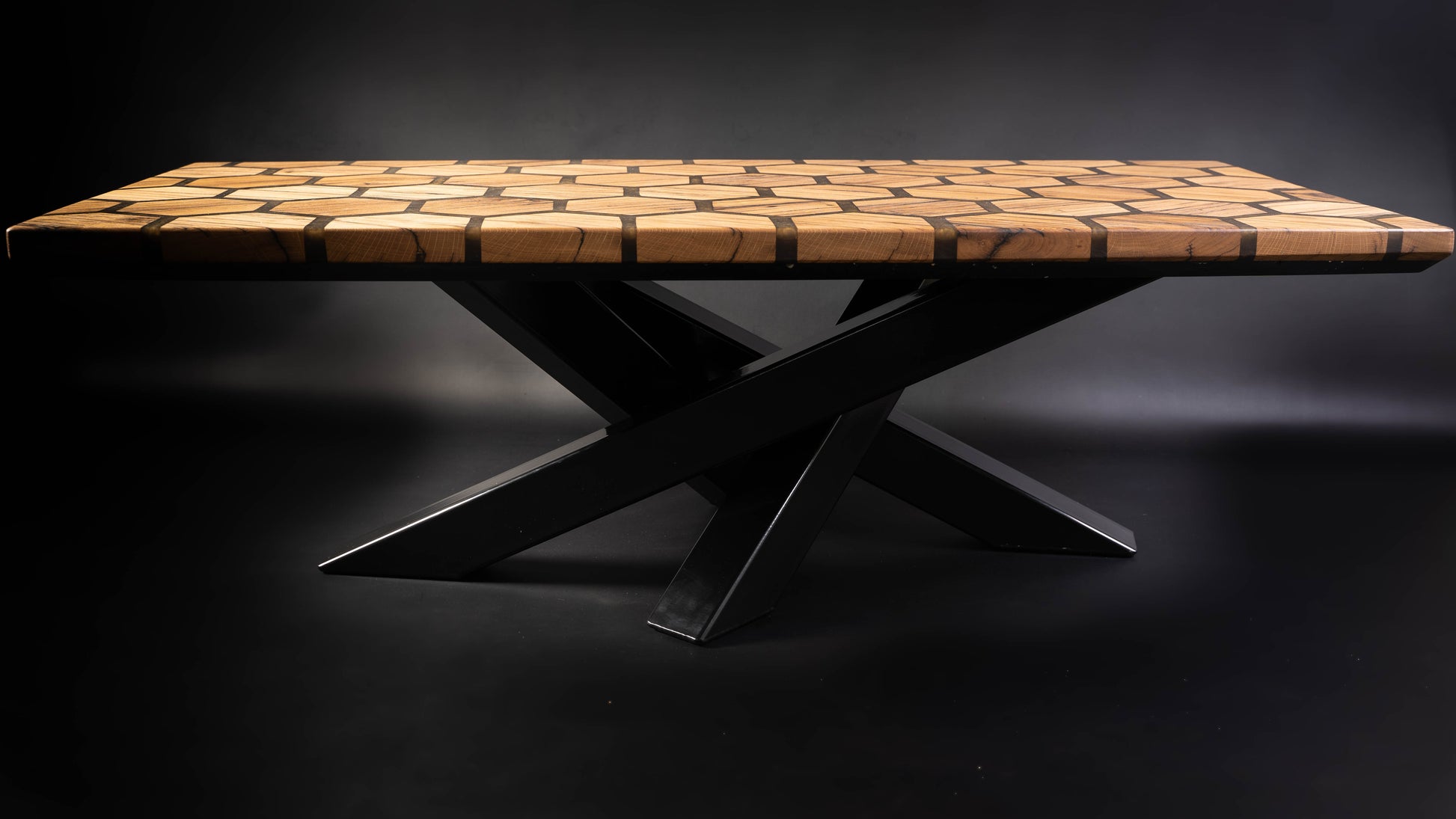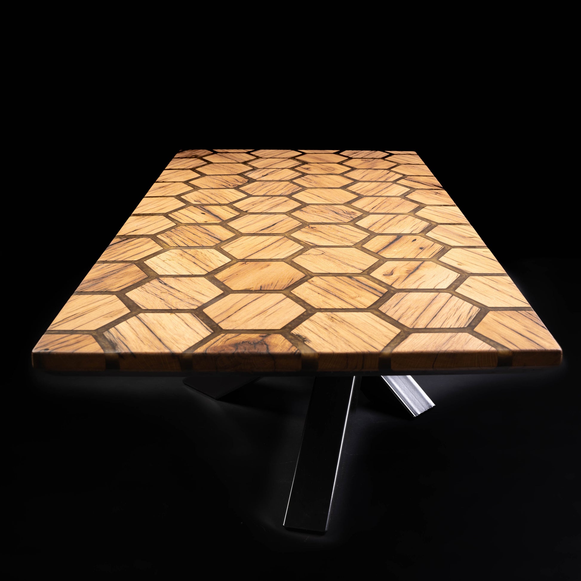 Handcrafted from solid European oak, each piece of wood is meticulously arranged in a hexagonal pattern and bound together with deep black epoxy — creating a bold contrast that celebrates natural beauty through modern design.