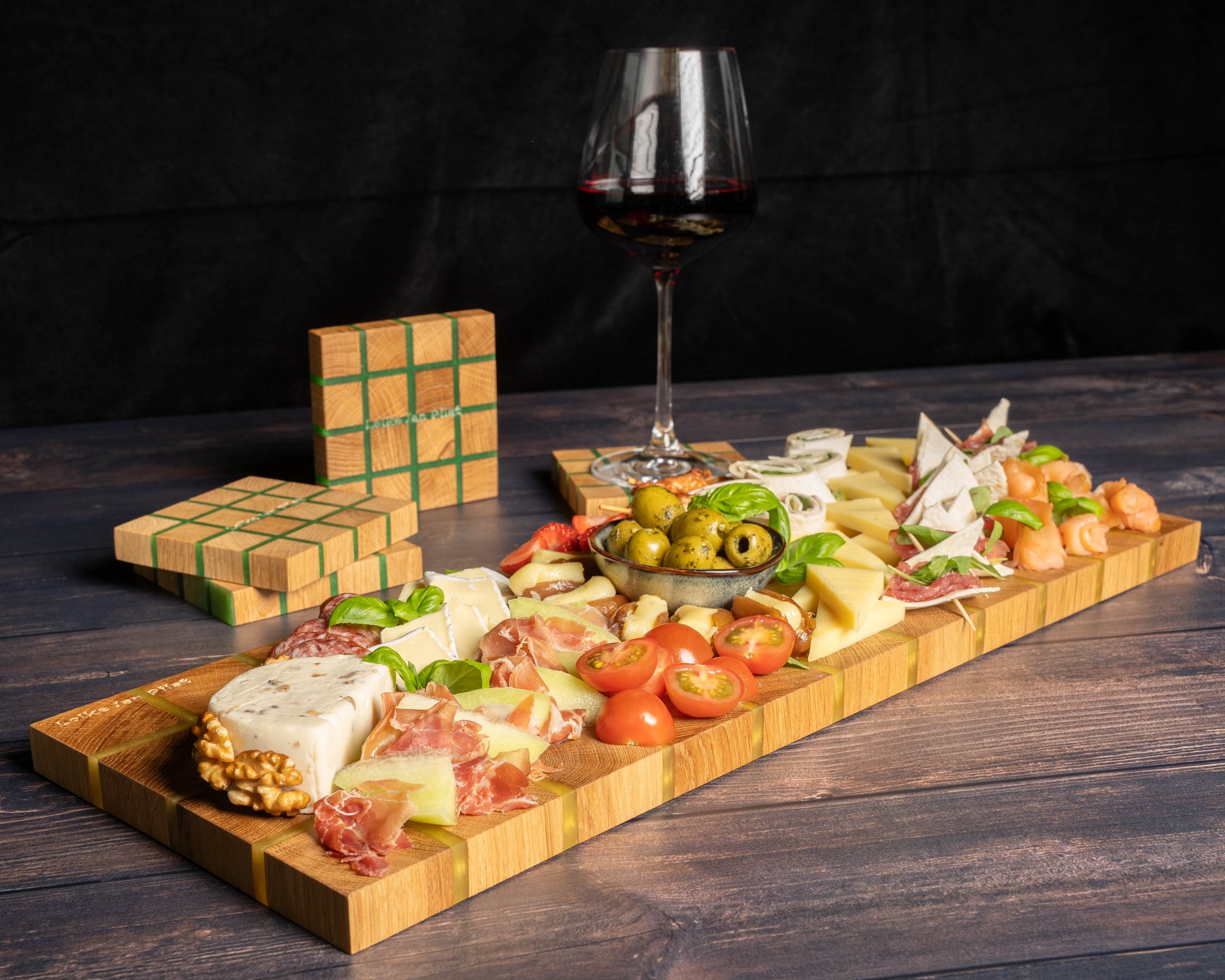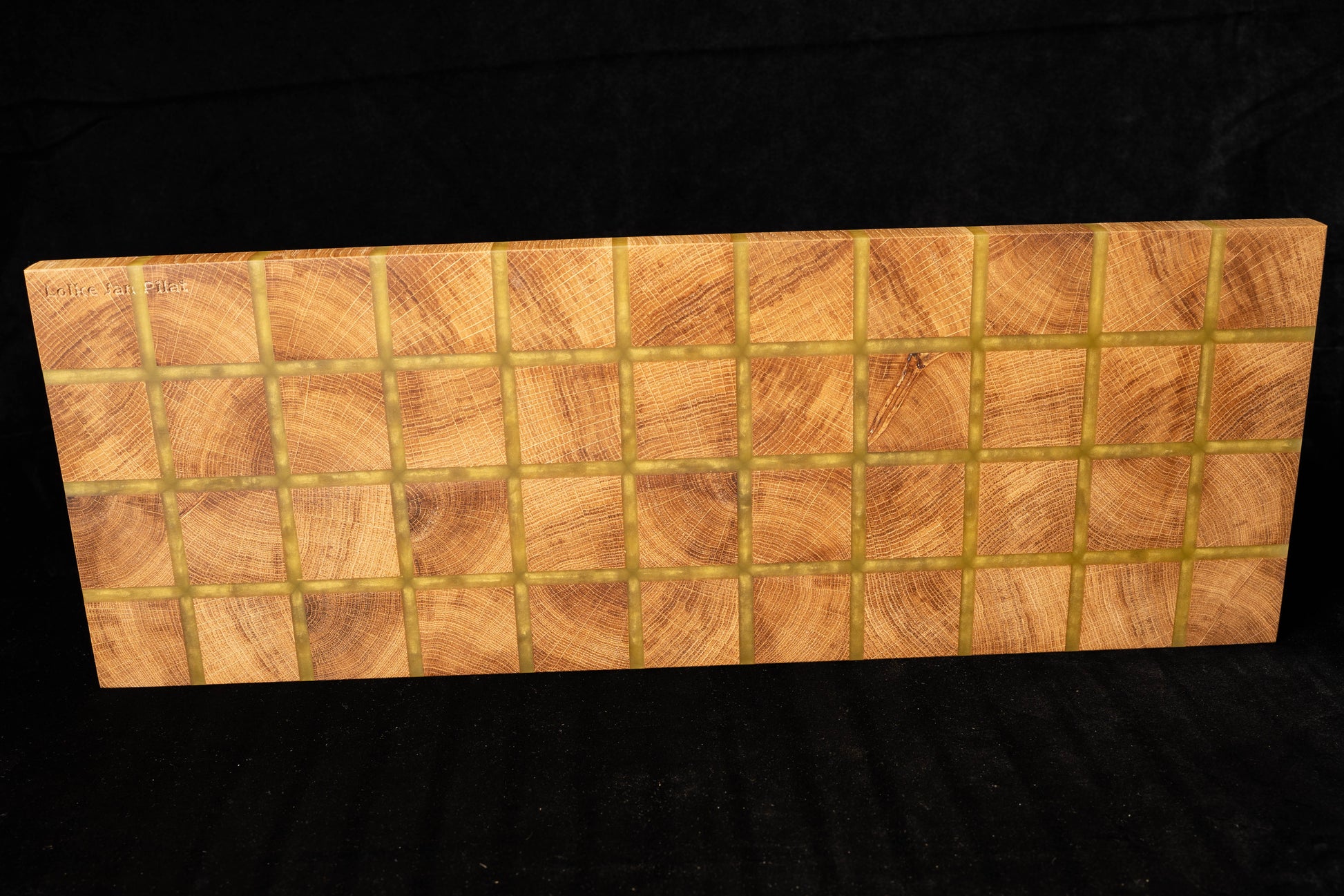Handcrafted from solid European oak, each piece showcases the wood’s natural end-grain pattern, meticulously inlaid with translucent gold epoxy that catches the light from every angle. The result is a functional sculpture — both a serving board and a statement of design.