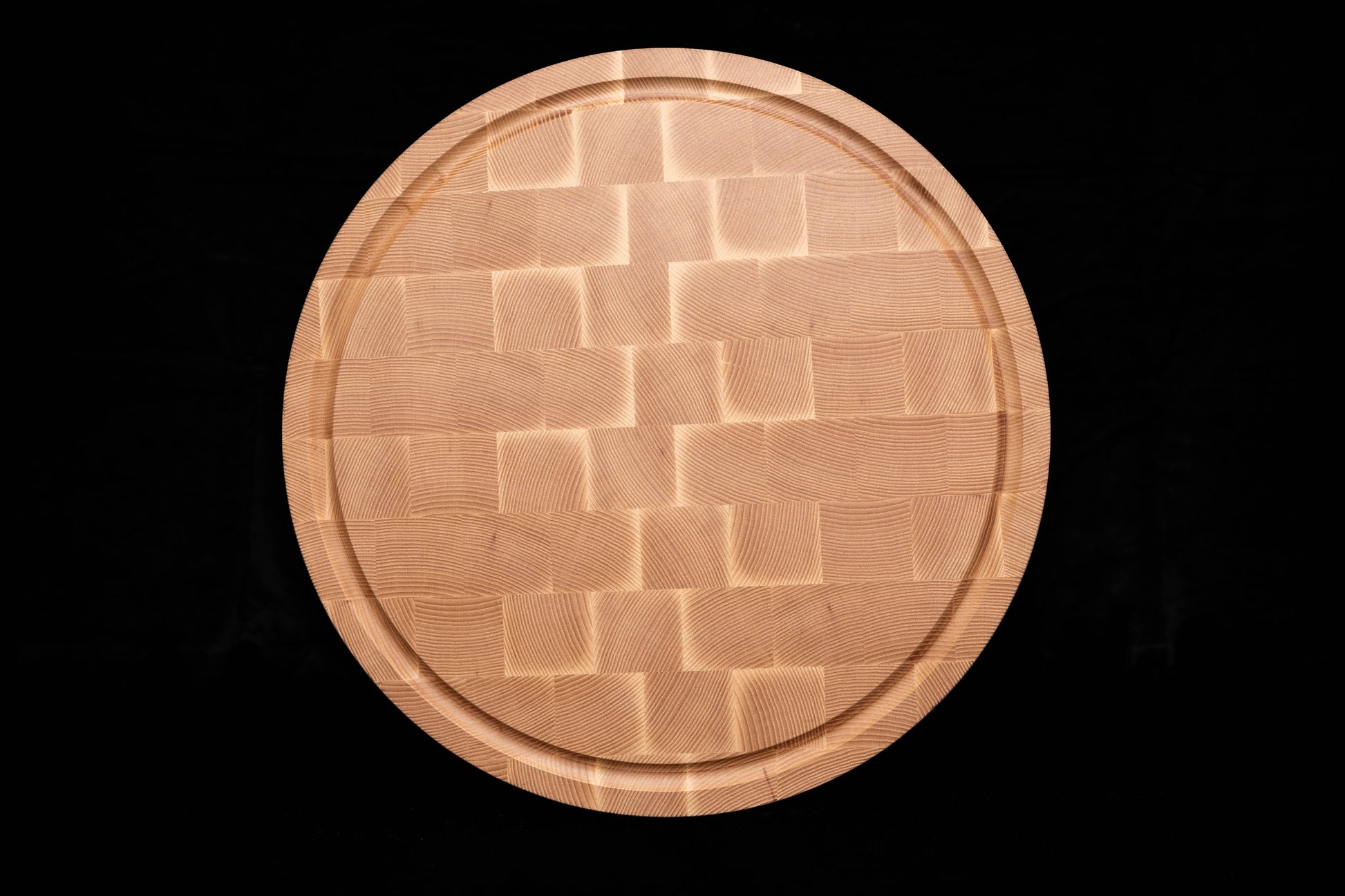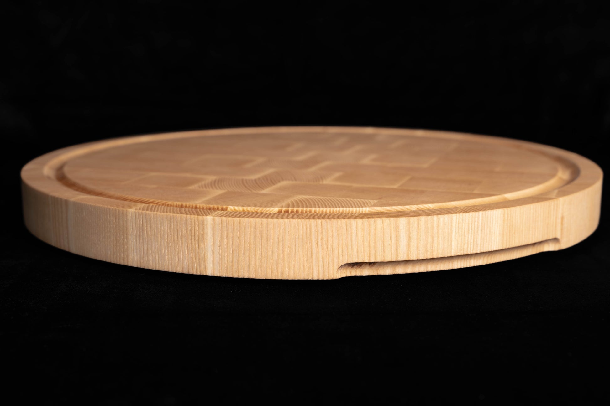 This round cutting board is made from solid ash wood, using the end-grain technique for strength, durability, and a distinct checker pattern that highlights the natural beauty of the wood.